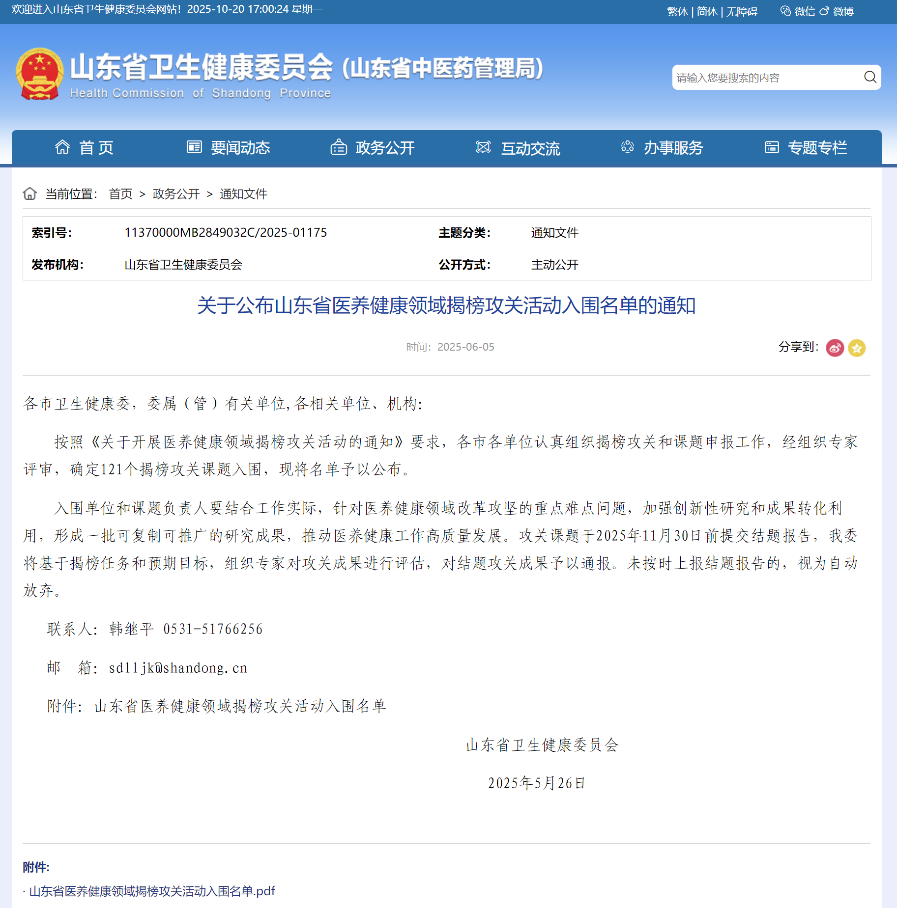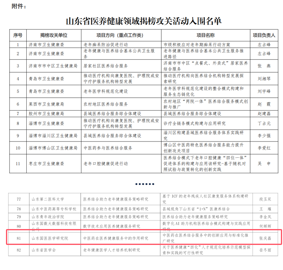 关于公布山东省医养健康领域揭榜攻关活动入围名单的通知